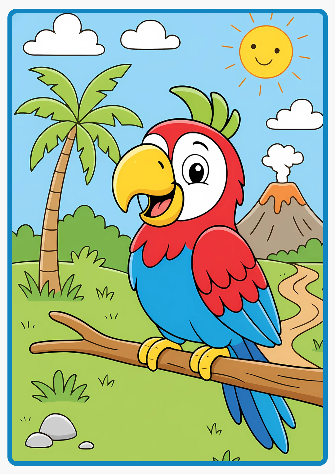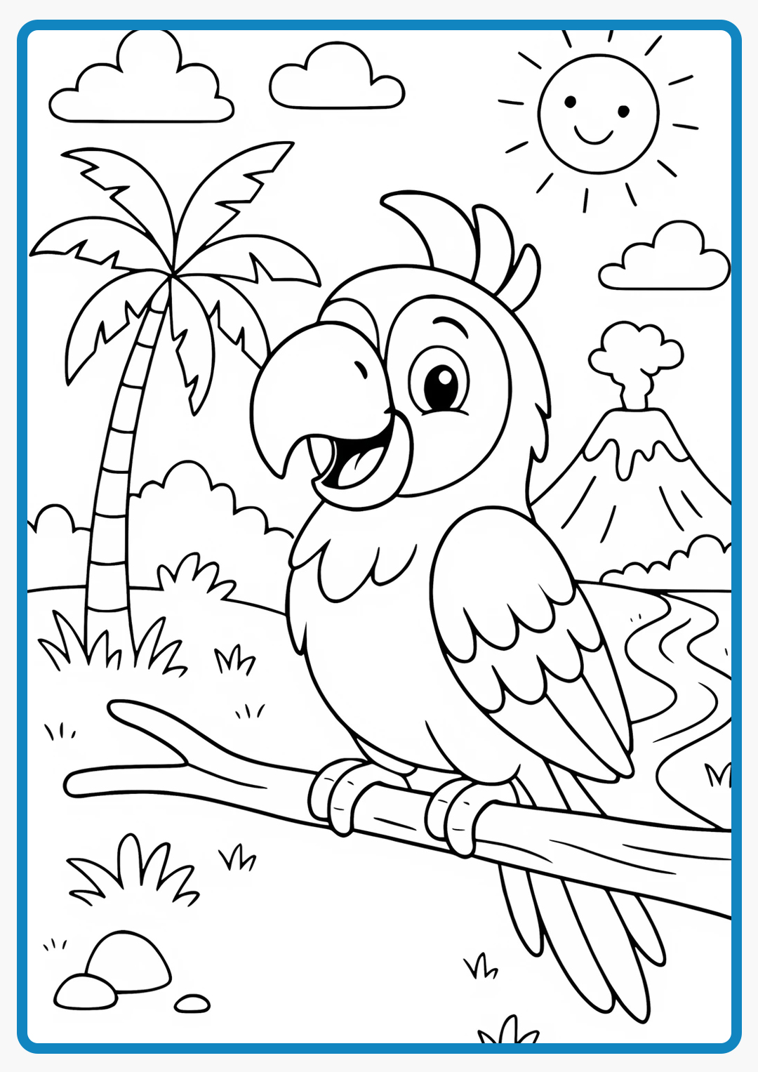 A cartoon parrot is standing on a tree trunk in the jungle coloring book